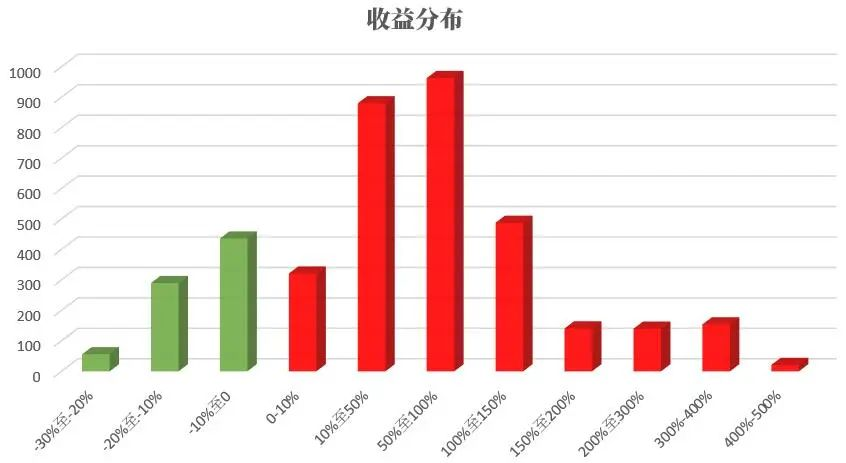 從中我們可以看到,獲得極高與極低收益次數(shù)的機會都比較少,最多的收益區(qū)間還是落在50%-100%當(dāng)中,而平均收益率68.55%也在這一區(qū)間之中。其實,只要采用持有這一簡單的行為,大概率上我們會獲得一個還不錯的收益。